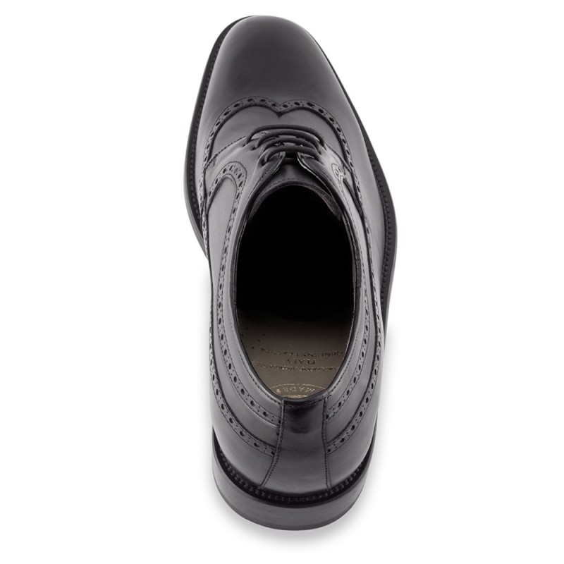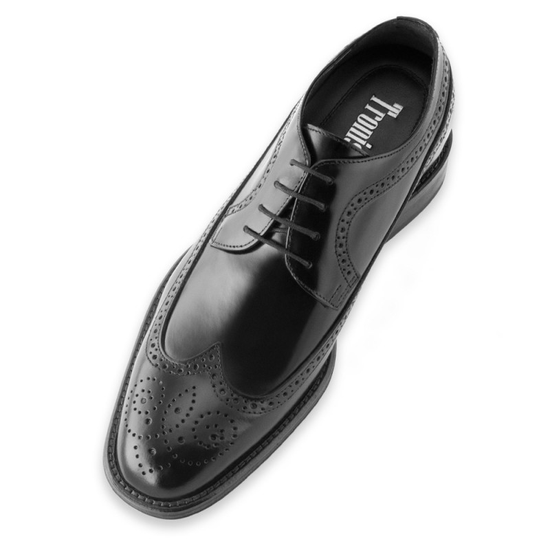 Chaussures Réhaussantes. Dessus en peau box-calf de première qualitè. Doublure en peau fine. Semelle en cuir naturel. Talon en cuir naturel renforcé.