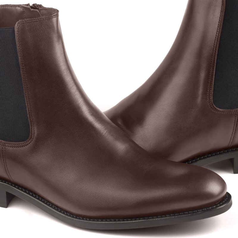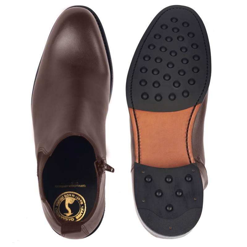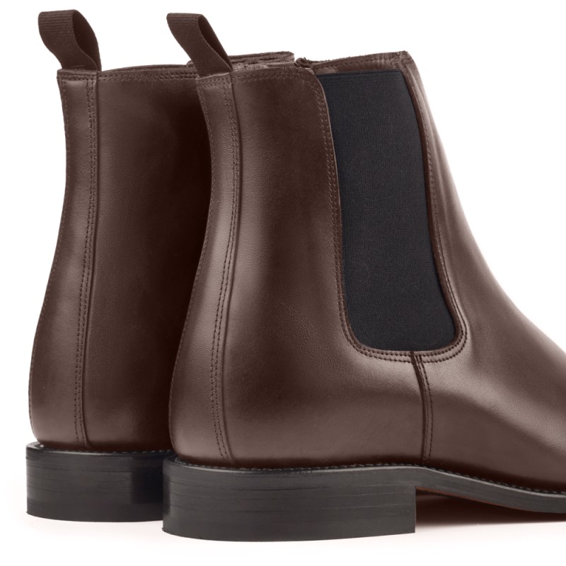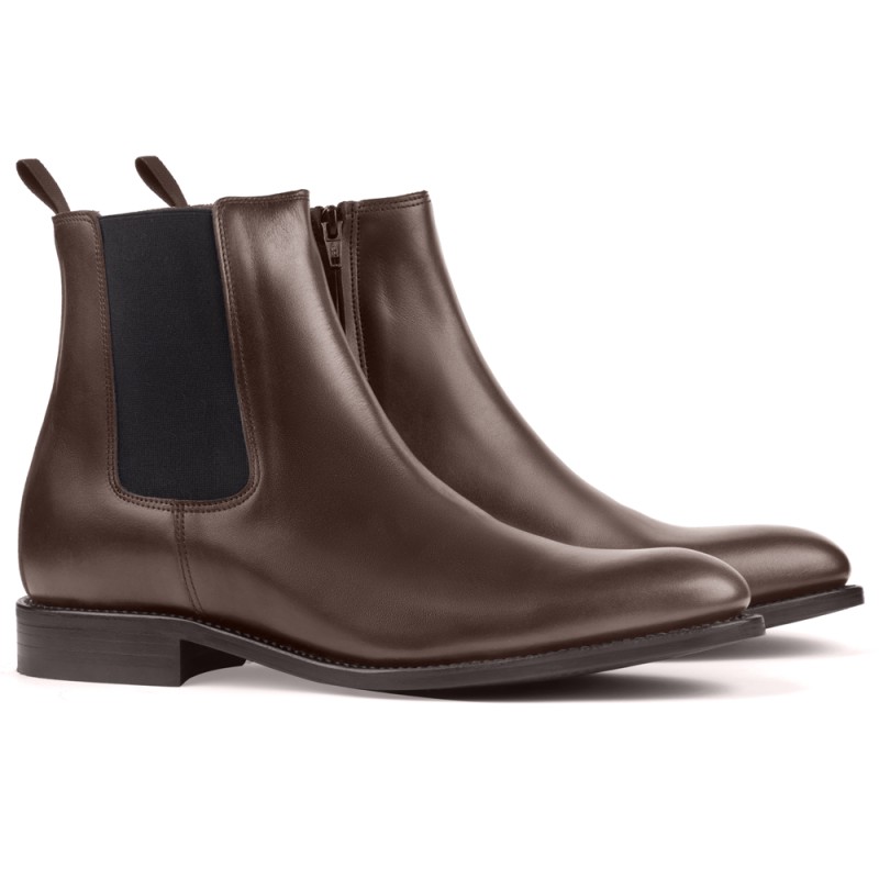 Flavio. Stivali con rialzo di qualità Goodyear-welt. Goodyear-welt è la denominazione internazionale di un particolare tipo di scarpe. È la migliore calzatura disponibile sul mercato e, sebbene il suo particolare sistema di lavorazione lo renda più rigido quando è nuovo, è concepito per offrire totale comfort e cura per i piedi. Si tratta di una garanzia di lavoro artigianale in quanto prodotto che può essere prodotto solo a mano e nel quale si utilizzano materie prime di qualità superiore. È adatto a vestire e abbinare abiti o costumi da sport. La sua suola in cuoio e tacco rinforzato in gomma ne accentuano l'eleganza. Si raccomanda di pulire gli stivali che sollevano l'altezza con crema e un panno asciutto o una spazzola trasparente strofinando delicatamente. Si può finire con una spugna lucidante.
